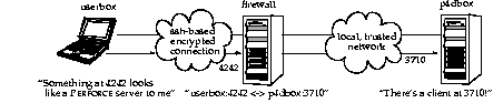 Normally, setting P4PORT=4242 would normally indicate that we are trying to connect to a Perforce server on the local machine listening at port 4242. In this case, ssh takes the role of the Perforce server. Anything a client sends to port 4242 of the local machine is forwarded by ssh to the firewall, which passes it to the real Perforce server at p4dbox.bigcorp.com. Since all of this is transparent to the Perforce client, it doesn't matter whether the client is talking to an instance of ssh that's forwarding traffic from port 4242 of the local machine, or if it's talking to a real Perforce server residing on the local machine.