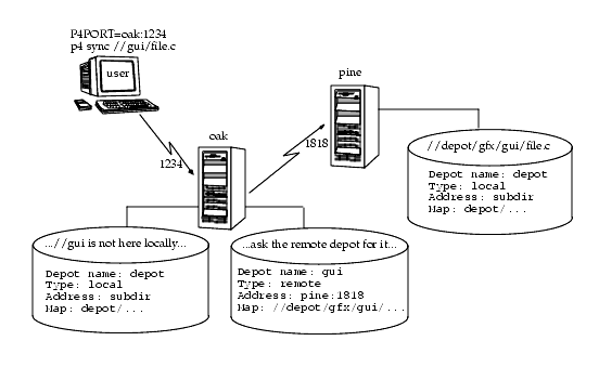 When using remote depots, the user's Perforce client uses its default Perforce server as a proxy client to a second, remote, Perforce server. Because of this proxy behavior, the client doesn't need to know where the files are actually stored, and doesn't need direct access to the remote Perforce server.