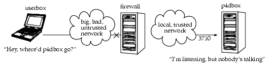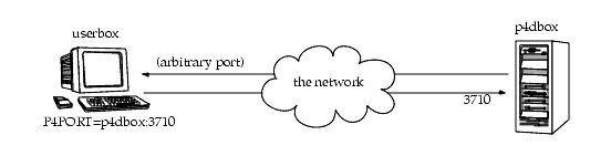 Suppose the Perforce server is on p4dbox.bigcorp.com, and the firewall machine is called firewall.bigcorp.com. In our example, we'll arbitrarily choose local port 4242, and assume that the Perforce server is listening on port 3710.
