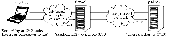 Normally, setting P4PORT=4242 would normally indicate that we are trying to connect to a Perforce server on the local machine listening at port 4242. In this case, ssh takes the role of the Perforce server. Anything a client sends to port 4242 of the local machine is forwarded by ssh to the firewall, which passes it to the real Perforce server at p4dbox.bigcorp.com. Since all of this is transparent to the Perforce client, it doesn't matter whether the client is talking to an instance of ssh that's forwarding traffic from port 4242 of the local machine, or if it's talking to a real Perforce server residing on the local machine.