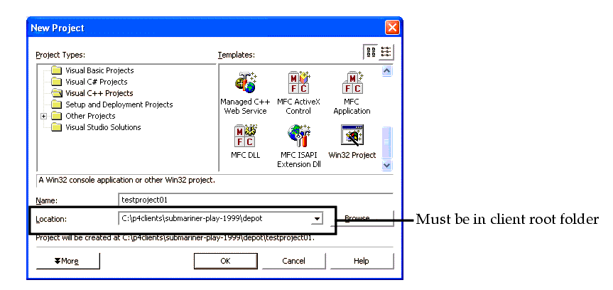 When you create a project you intend to manage with Perforce, specify a location that resides within the Perforce client root folder of the client you intend to use as illustrated in the following figure.