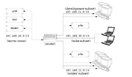 If network bandwidth on the same subnet as the central Perforce server is nearly saturated, deploying proxy servers on the same subnet will not likely result in a performance improvement. Instead, deploy the proxy servers on the other side of a router so that the traffic from the clients to the proxy server is isolated to a subnet separate from the subnet containing the central Perforce server.