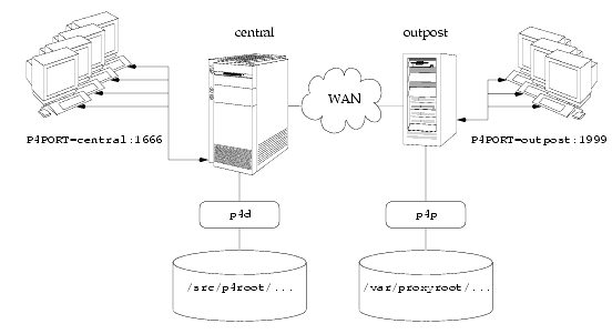 In this configuration, file revisions requested by users at a remote development site are fetched first from a central Perforce server (p4d running on central) and transferred over a relatively slow WAN. Subsequent requests for that same revision, however, are delivered from the Perforce Proxy, (p4p running on outpost), over the remote development site's LAN, reducing both network traffic across the WAN and CPU load on the central server.