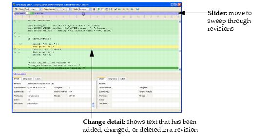 P4V displays the changes as shown in the following figure. This example shows that, between the selected revisions, a file was edited and checked in. File highlights are color-coded to indicate additions, changes, and deletions. Expand folders and scroll to locate changes of interest. To skip to the next or previous change, click the right and left arrows