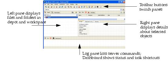 The following figure points out the panes and important features of the main screen. To see what a button or screen element does, hold the mouse cursor over it. P4V displays a descriptive tooltip.