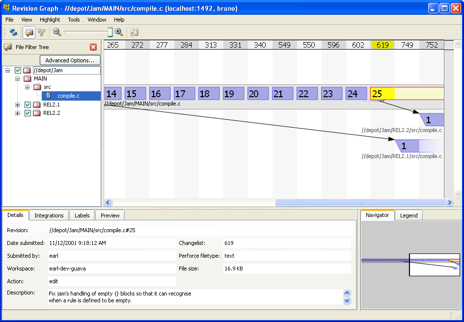 This diagram shows you when the file was created and how it was branched, and enables you to view details about each version submitted to the depot and navigate through the graph using the navigation map. For more details about the information displayed in the revision graph, consult P4V online help.