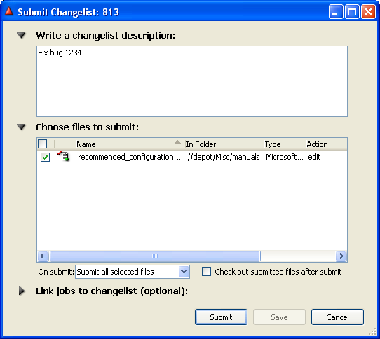 Note that, when you check out a file, Perforce adds it to a changelist, which is a list of related files. You can use changelists to group related files, for example, all files that contain changes required to implement a new product feature. To view the changelist, choose or click
