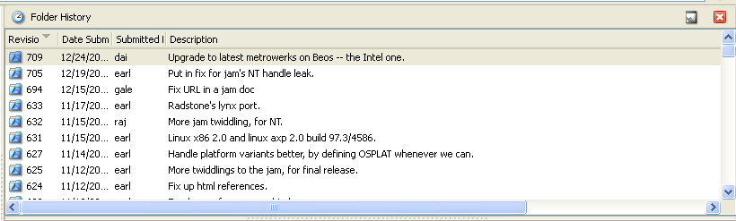 To view the changes made to a file or folder, context-click the file or folder and choose or . The history for the selected file or folder is displayed in the right pane. For example, the following figure shows the history of a folder, listing every submitted changelist that affected a file in the folder.