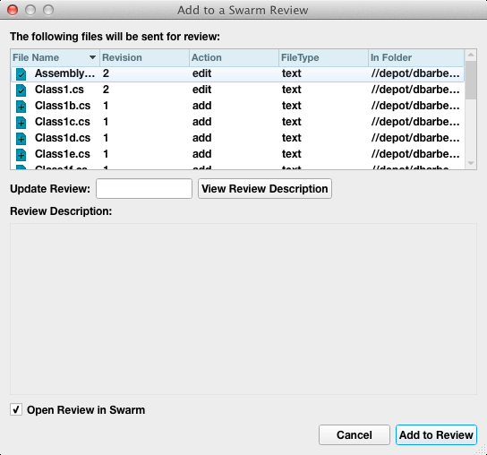 The Add to a Swarm Review dialog displays a list of files to be added to the review.