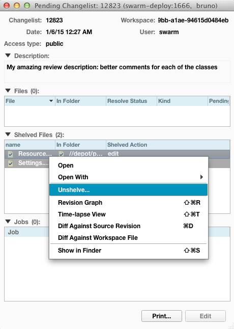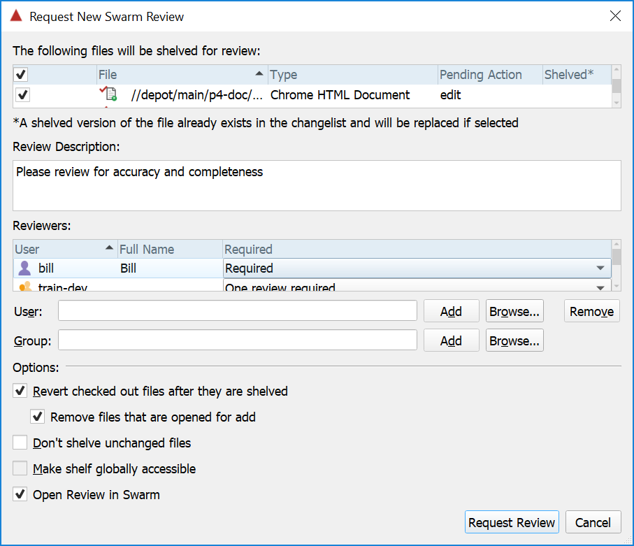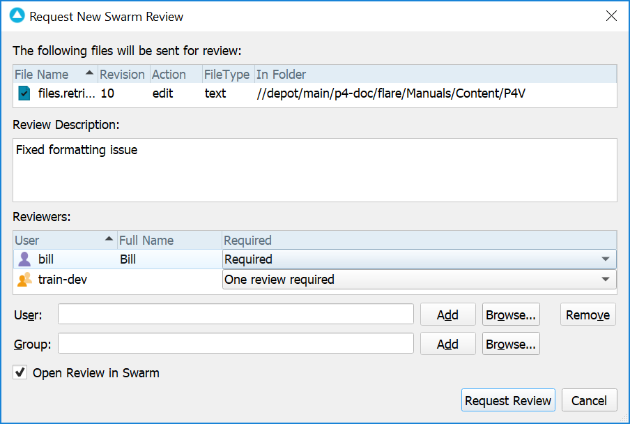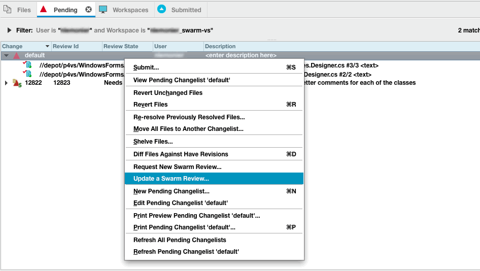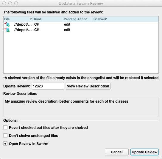 If you need to update the files in a review for any reason, such as to respond to the feedback you received from the reviewers, P4V lets you update an existing Swarm review.