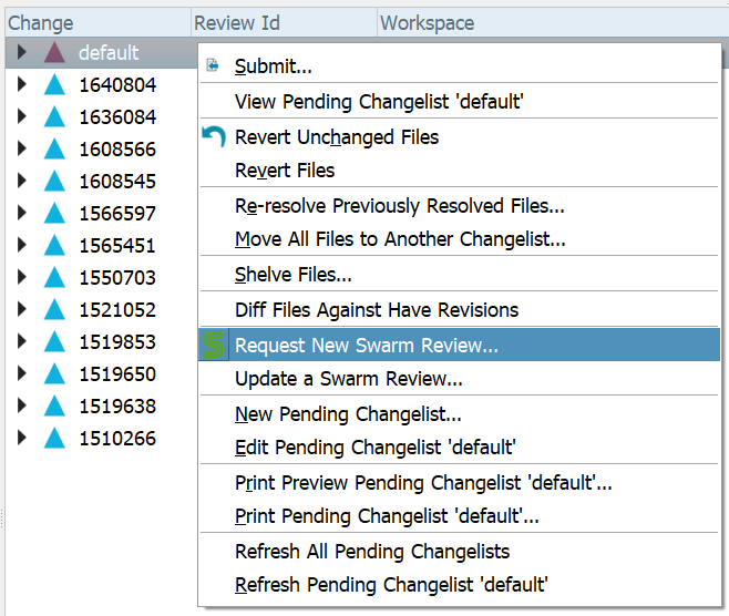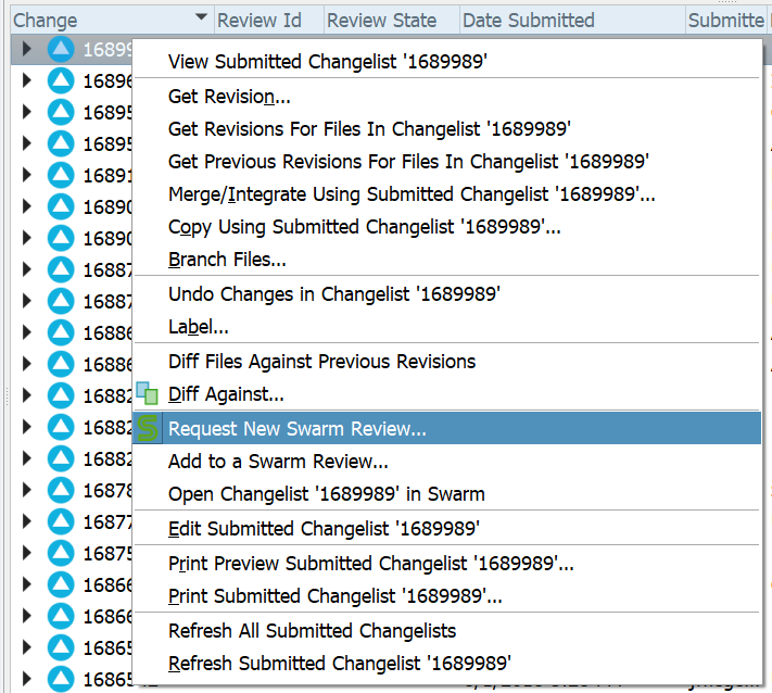 When Swarm integration is enabled, a number of additional features is available in P4V, including new context menus, request review and update review dialogs, badging on pending changes, committed changes, and history, as well as Review ID and Review State columns.
