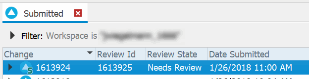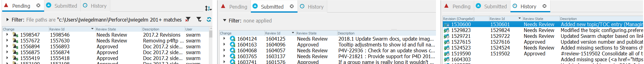 P4V adds a Review Id and Review State column to the Submitted and Pending tabs and the History tab for connections that have the Swarm integration enabled.