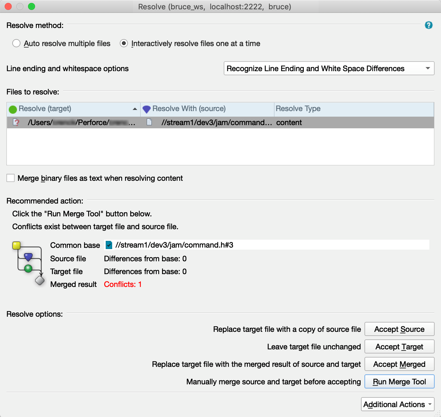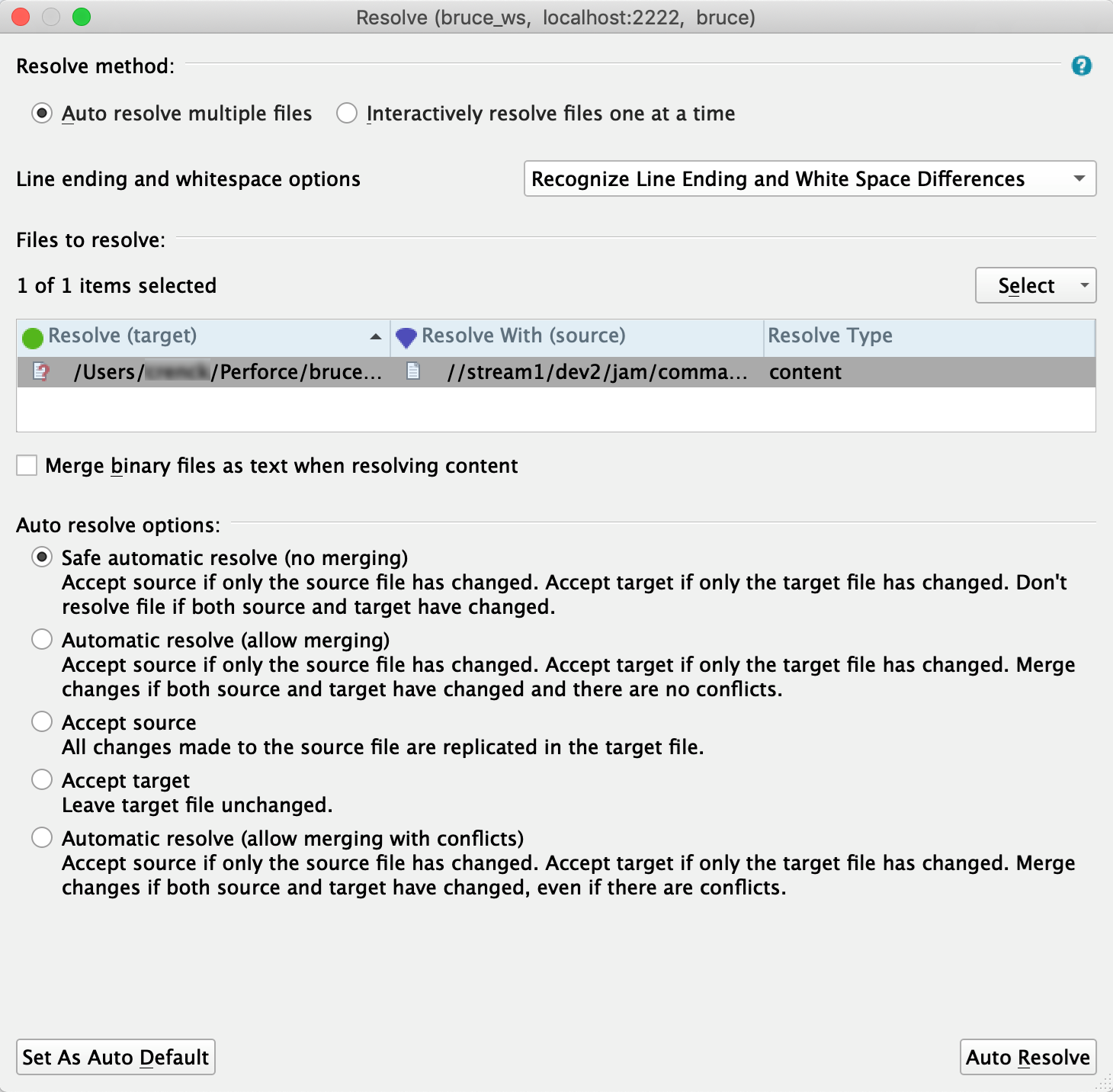 - Safe automatic resolve (no merging): Accepts the source file (the file in the depot) if it has the only changes. Accepts the target file (the file in your workspace) if it has the only changes. Doesn’t resolve if both the source and target have changed.