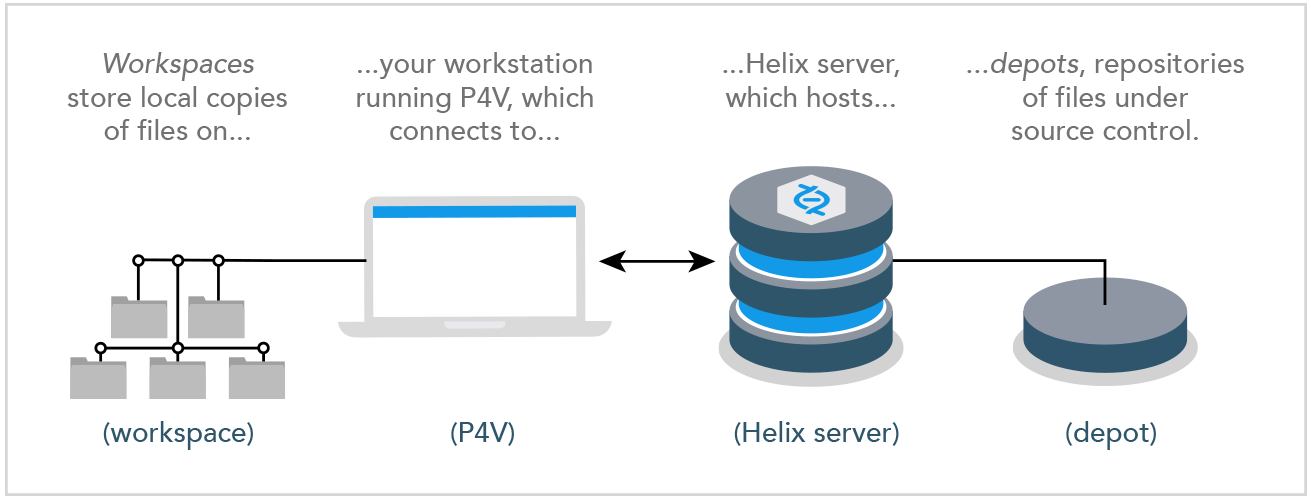 - Helix Core app: P4V (or another Helix Core application, like the command-line client or P4VS, the Helix Plugin for Visual Studio), running on your workstation, which makes requests from the Helix Core server and delivers the results of those requests (files, status information, and so on) to you.