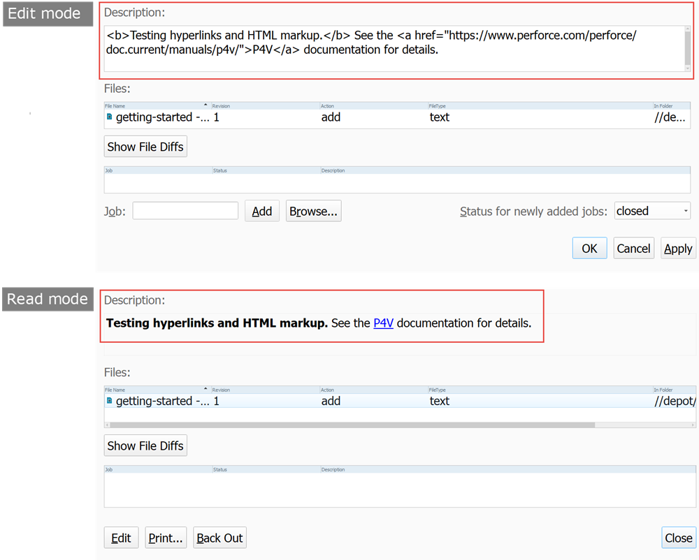 In edit mode, P4V supports internal and external drag-and-drop, cut and paste, and undo/redo operations in the Description fields of what is generally referred to as specs, such as job specs, workspace specs, stream specs, branch specs, and so on. In addition, you can use HTML syntax to mark up text and create hyperlinks.
