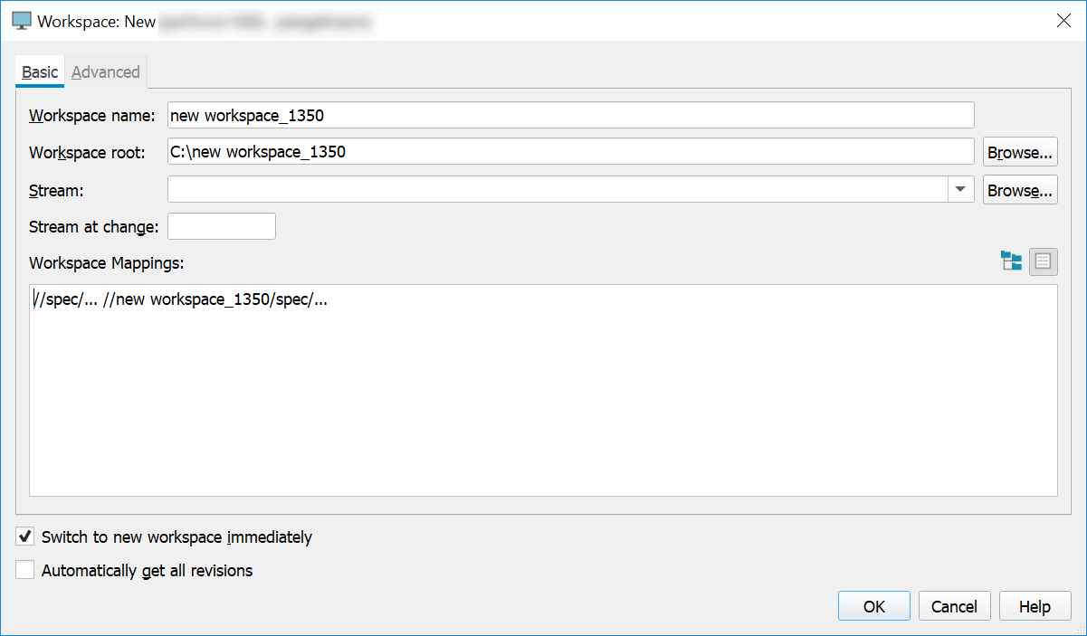 NoteThis dialog only appears if P4V is configured to prompt for a new workspace name. This is not the default behavior.