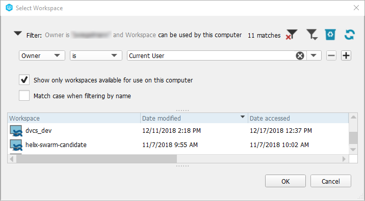 You can use filters to search for workspaces in the Workspaces tab and the Select Workspace dialog. You can filter workspaces by any combination of the following: