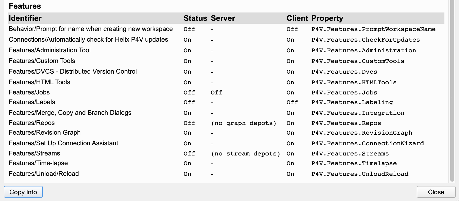 Property shows the name of the server property (see Feature-related P4V properties in Helix Core Server Administrator Guide)