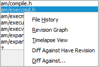 In the dialogs that display files in a plain-text list, the action, such as submit or resolve, applies to all the files that have not been filtered out of the list. To see file history, right-click any file in the list:
