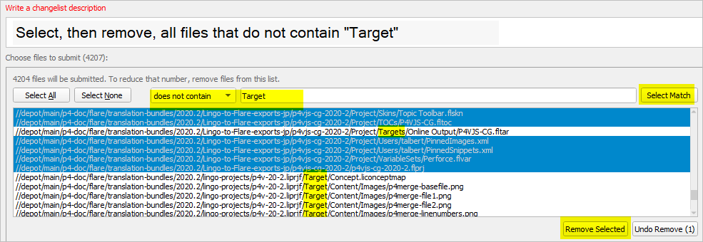 Specifies the maximum number of files displayed in a changelist. This setting affects only the display of changelists and does not limit the number of files that a changelist can contain. If the number of file exceeds this maximum, the Submit, Shelve, Unshelve, Revert, and Resolve dialogs display the files in a plain-text list. You can filter the list of files and remove any files you want to remove from the changelist. You can also undo one or more removals of files from the changelist: