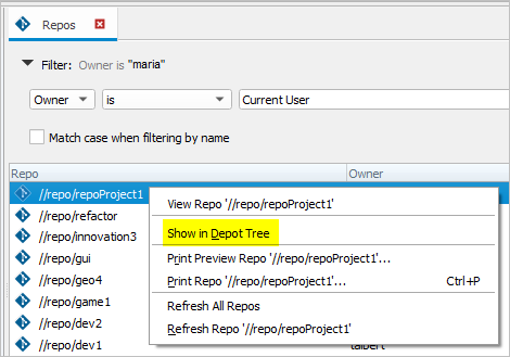 The Repo tab's context menu makes it easy to see that repo in the Depot tree: