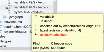 file. For example, this tooltip indicates another user has an "exclusive checkout" on the variable.h file: