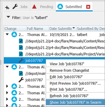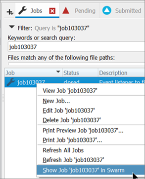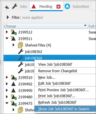You can show a job in Swarm from a context menu in the Jobs tab, the Pending Changelist tab, or the Submitted Changelist tab: