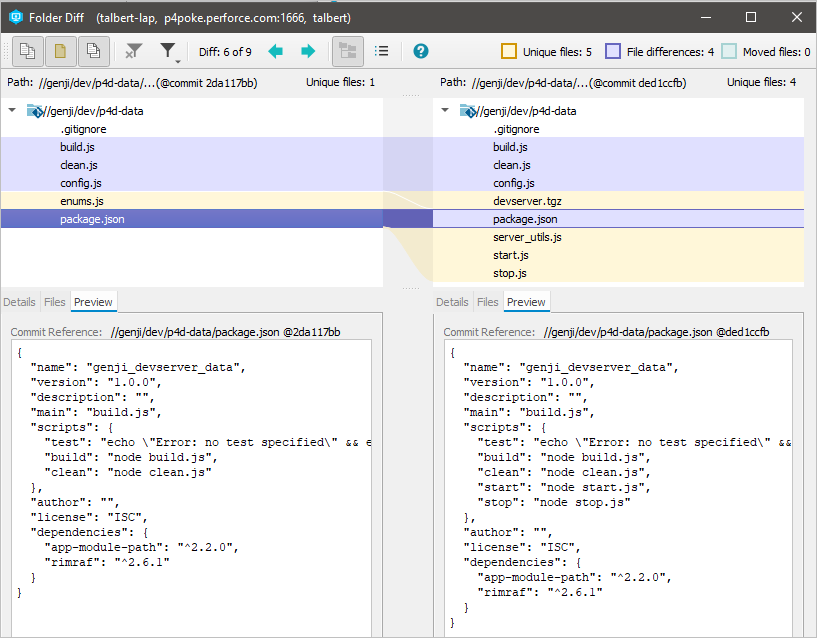 - Details, such as Commit, Tree, Author, Committer, Action, Date, and Description
